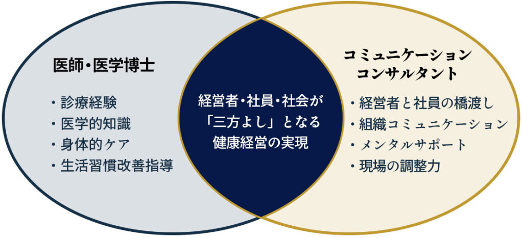 経営者の抱える悩み、社員の抱える悩み、そこには多くの悩みが存在します。私は医師として人の健康のサポートを得意としますが、会社の健康を守るには一人では荷が勝ります。